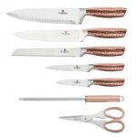 Material: stainless steel Sizes: 20 cm chef knife 20 cm bread knife 20 cm slicer knife 12,5 cm utility knife 9 cm paring knife sharpener Scissors 360 � acryl stand Color: metallic rose gold PRECISE LASER CUT STAINLESS STEEL BLADE ERGONOMICALLY DESIGNED DURABLE, NON-SLIP HANDLE THAT PERFECT FOR PREPARING THE FOOD FAST THE BLADE FIT PERFECTLY INTO THE STAND ACRYLIC STAND TURN IN 360 � STYLISH SPECIAL BURGUNDY EDITION ELEGANT DESIGN